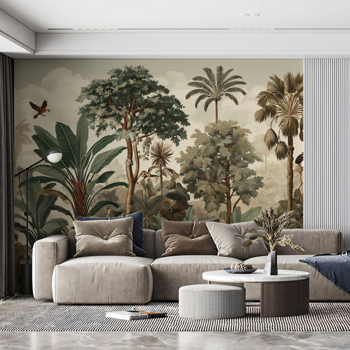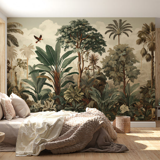 Vollständige Details anzeigenVintage Tropical Mural Wallpaper | Exotic Wildlife & Misty Landscape