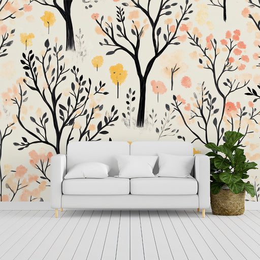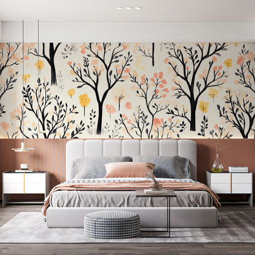 Vollständige Details anzeigenWhimsical Forest Mural Wallpaper | Artistic Tree & Blossom Print