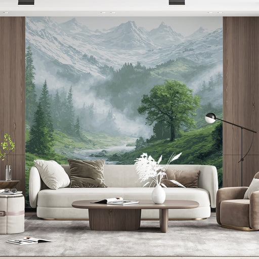 Vollständige Details anzeigenLush Misty Alpine Valley Mural - Serene Watercolor Mountain Stream