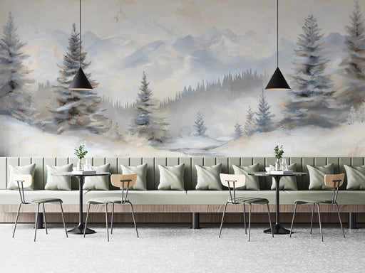 Vollständige Details anzeigenSoft White Alpine Mountains and Pine Forest Oil Painting Wall Mural