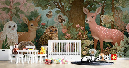Vivawalls StoreStep into a vibrant storybook forest with this expansive wildlife wall mural. Featuring a pair of gentle deer, curious owls, a hedgehog, and a bird...