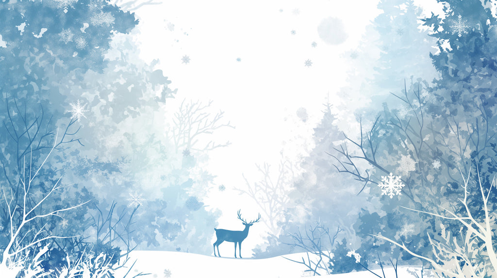 Die Farbpalette wird von verschiedenen Blautönen dominiert, die zusammenwirken, um ein kohärentes und beruhigendes Aussehen zu schaffen. Die weißen Elemente, wie der Schnee und der Umriss des Rehes, verleihen einen Hauch von Helligkeit und Kontrast und steigern das visuelle Interesse. Der hellblaue Hintergrund vermittelt ein Gefühl von Tiefe und Raum, wodurch der Raum offener erscheint.