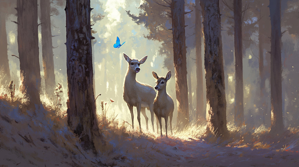 Die Farbpalette ist harmonisch und beruhigend. Die braunen Töne des Rehes und der Bäume bilden eine natürliche und erdige Grundlage, während der blaue Schmetterling und der goldene Glanz Kontrast und Wärme hinzufügen. Die gedämpften Farben schaffen eine ruhige Atmosphäre, was es für Räume geeignet macht, in denen Entspannung gewünscht ist, wie ein Schlafzimmer oder ein Meditationsraum.