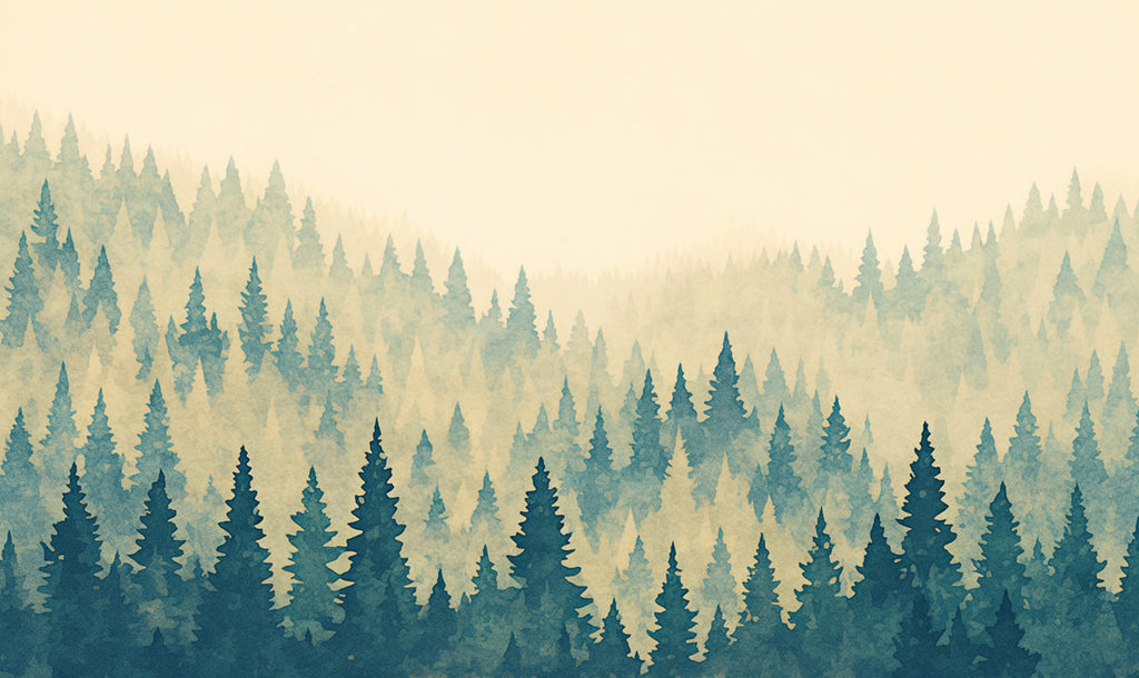 Dieses Hintergrundbild zeigt eine friedliche neblige Waldszene mit hohen Kiefern in verschiedenen Grüntönen und Blautönen, vor einem weichen Beige-Hintergrund. Der Nebel verleiht dem Wald eine geheimnisvolle und ruhige Atmosphäre, was das Zimmer wie einen friedlichen Rückzugsort in der Natur wirken lässt. Der Gesamteffekt ist beruhigend und eintauchend, bringt die Schönheit des Freilands ins Innere.