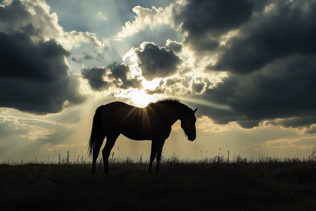 Das Tapetenmuster zeigt eine große Silhouette eines Pferdes unter einem stimmungsvollen Himmel, wobei moderne Glaslampen in Vordergrund hängen. Die Verschmelzung von Naturbildern und zeitgenössischen Elementen schafft einen visuell ansprechenden Mittelpunkt.
