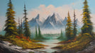Bring the invigorating freshness of the mountains to your home. This beautiful oil-painting style mural features sharp, snow-capped peaks rising above a lush forest and a tranquil mountain lake. The thick, vibrant brushstrokes and light-filled palette of brilliant yellows, crisp whites, and deep greens create a joyful and expansive atmosphere, ideal for a bedroom or entry hall.