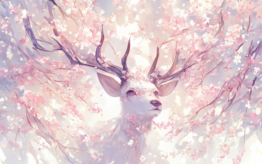 Dieses Hintergrundbild zeigt einen majestätischen Hirsch mit großen Geweihen, der in einem Wald mit rosa und lila Bäumen steht. Die sanften Pastellfarben schaffen eine traumhafte und bezaubernde Atmosphäre, die das Zimmer wie ein magischer Wald wirken lässt. Der Gesamteffekt ist beruhigend und visuell ansprechend, fügt dem Raum einen Hauch von Natur und Fantasie hinzu.