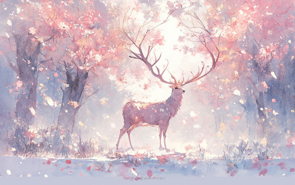 Dieses Hintergrundbild zeigt einen majestätischen Hirsch mit großen Geweihen, der in einem Wald mit rosa und lila Bäumen steht. Die sanften Pastellfarben schaffen eine traumhafte und bezaubernde Atmosphäre, die das Zimmer wie ein magischer Wald wirken lässt. Der Gesamteffekt ist beruhigend und visuell ansprechend und fügt dem Raum einen Hauch von Natur und Fantasie hinzu.