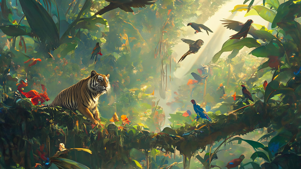 Die Farben in diesem Wallpaper sind harmonisch und lebendig. Die Grüntöne bieten eine natürliche und beruhigende Basis, während die warmen Töne von Orange und Rot des Tigers und der Blumen einen markanten Kontrast schaffen. Die Brauntöne in den Baumstämmen und Schatten fügen Tiefe und Ausgewogenheit zur Komposition hinzu. Diese Kombination von Farben macht das Wallpaper visuell ansprechend und geeignet, um eine lebhafte und naturinspirierte Atmosphäre zu schaffen.