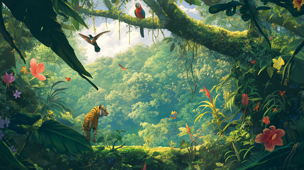 Die Farbpalette ist reichhaltig und harmonisch, wobei die Grünfarben eine natürliche und beruhigende Grundlage bilden. Die Akzente in Gelb und Blau verleihen visuelles Interesse und helfen, die Details der Szene herauszustellen. Die Kombination dieser Farben schafft eine lebendige und realistische Darstellung des Dschungels und macht es zu einem visuell atemberaubenden Hintergrundbild.