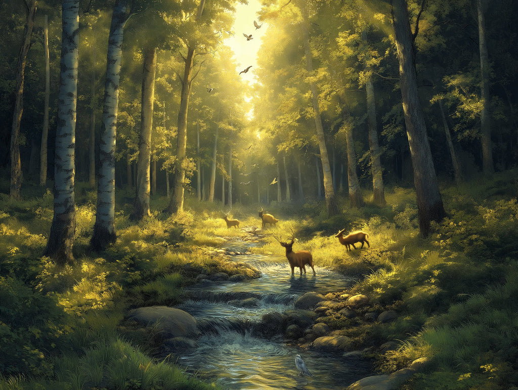 Dieses Hintergrundbild zeigt eine schöne Waldszene mit Rehen in einer sonnigen Lichtung. Die reichen Farben des Waldes, einschließlich verschiedener Grüntöne, Brauntöne und das goldene Licht, schaffen eine warme und eintauchende Atmosphäre. Es kann das Schlafzimmer wie einen friedlichen Rückzugsort in der Natur wirken lassen, fördert Entspannung und ein Gefühl der Ruhe.