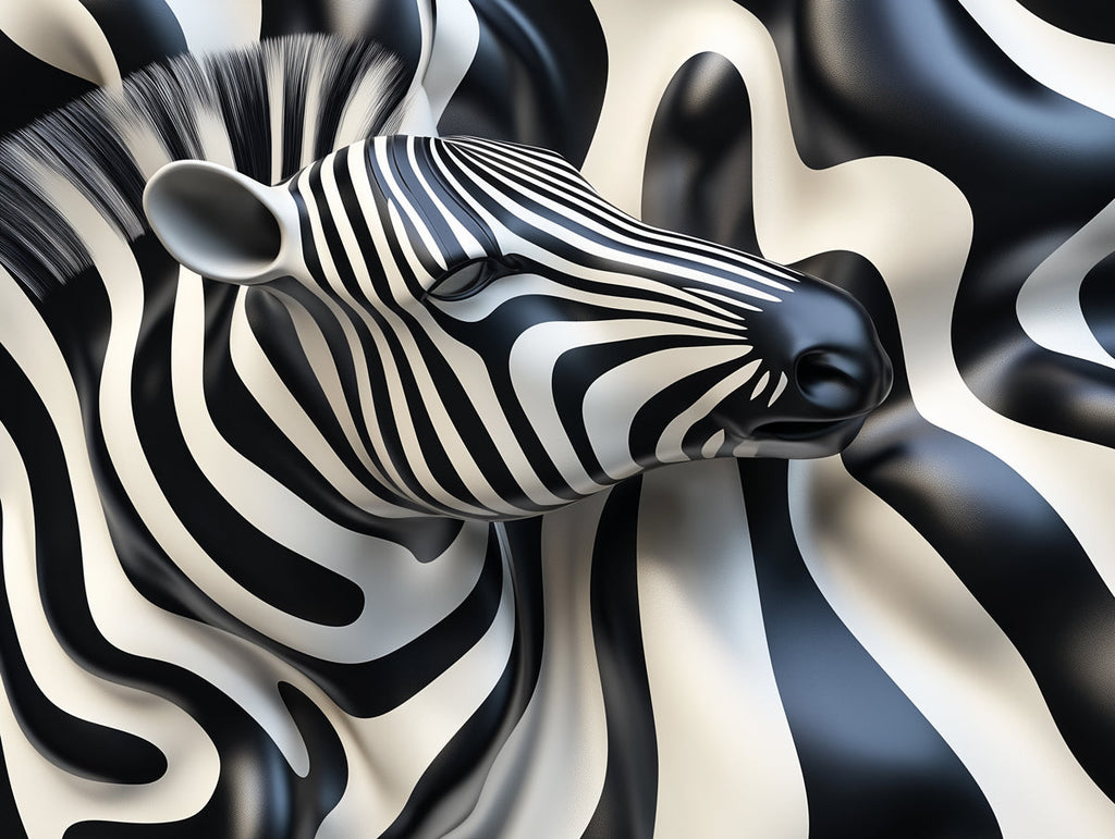 Die Schwarz - Weiß - Farben sind harmonisch und erzeugen eine zusammenhängende und visuell ansprechende Szene. Das Zebra und das abstrakte Muster arbeiten zusammen, um eine dynamische und interessante Komposition zu schaffen.
