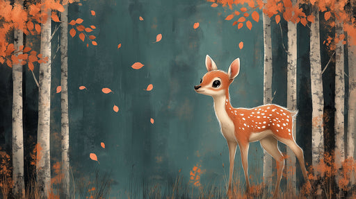 Vollständige Details anzeigenBlaues Waldbild mit Rehen und Herbstlaub Wandtapete für ein Kinderzimmer | Blau, Orange und Weiß Liebes