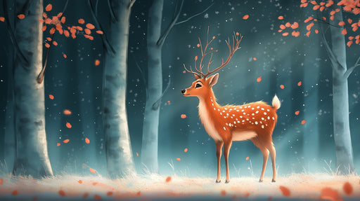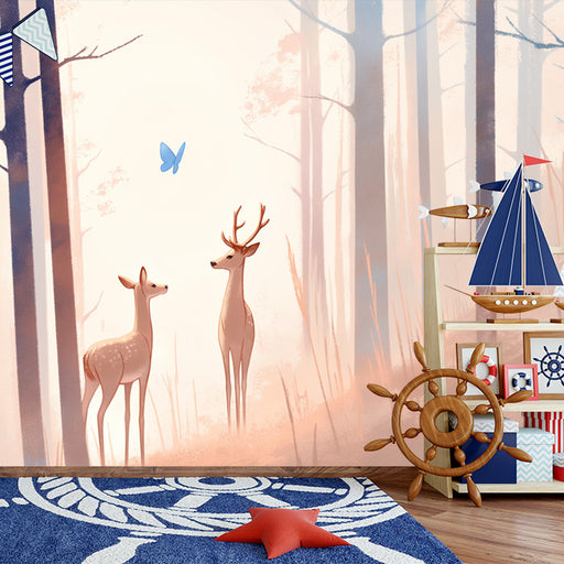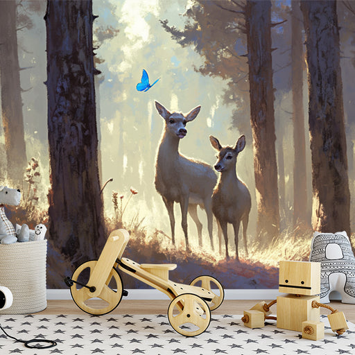 Vollständige Details anzeigenHirsch im Wald Glühen Wandbildtapete für ein Kinderzimmer | Braun, Blau und Gelber Wald