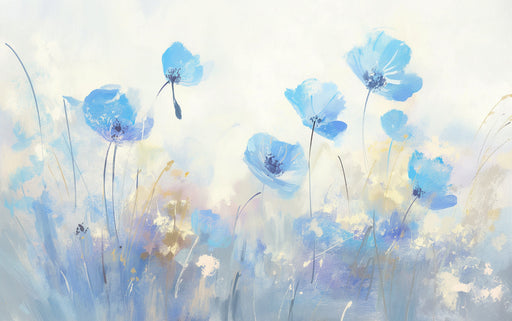 Vollständige Details anzeigenBlaue Blumenfeld-Mural-Tapete für die Wand eines Schlafzimmers | Blau Beige und Braune Blume