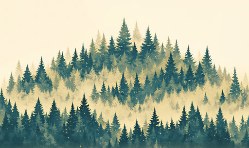 VivawallsDieses Hintergrundbild zeigt eine Waldszene, umhüllt von Nebel, mit hohen grünen Kiefern, die aus einem beigen Hintergrund aufragen. Die grünen Bäu...