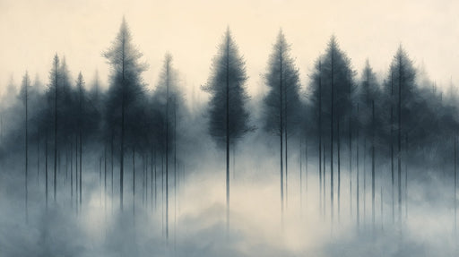 VivawallsDieses Hintergrundbild zeigt eine friedliche neblige Waldszene mit hohen Kiefern in verschiedenen Grüntönen und Blautönen, vor einem weichen Beige-...