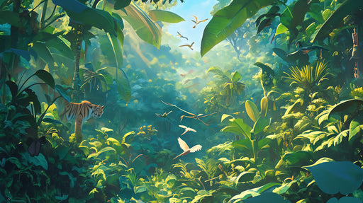 VivawallsDieses Hintergrundbild zeigt eine üppige tropische Dschungelszene mit einem majestätischen Tiger, der sich zwischen dem dichten Laub versteckt. Die...