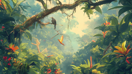 VivawallsDieses Hintergrundbild zeigt eine lebendige tropische Waldszene mit bunten Papageien, die auf Ästen sitzen und zwischen üppigem Grün fliegen. Die t...