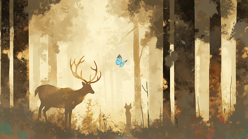 Vollständige Details anzeigenVintage Hirsch im Wald Wandbildtapete | Braun, Gelb und Blauer Hirsch