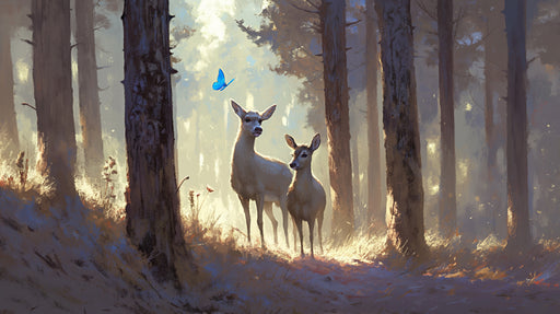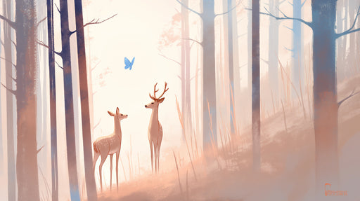 VivawallsDieser Tapetenmuster zeigt eine friedvolle Szene mit zwei Rehen in einem Wald, der in einem sanften, goldenen Glanz erstrahlt. Die hohen Bäume verm...
