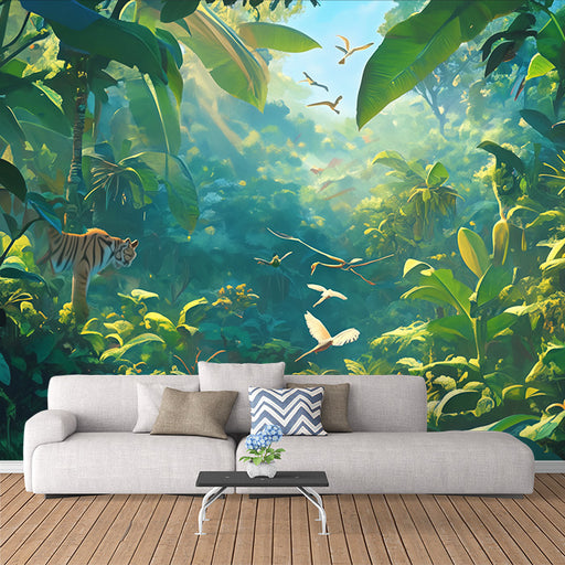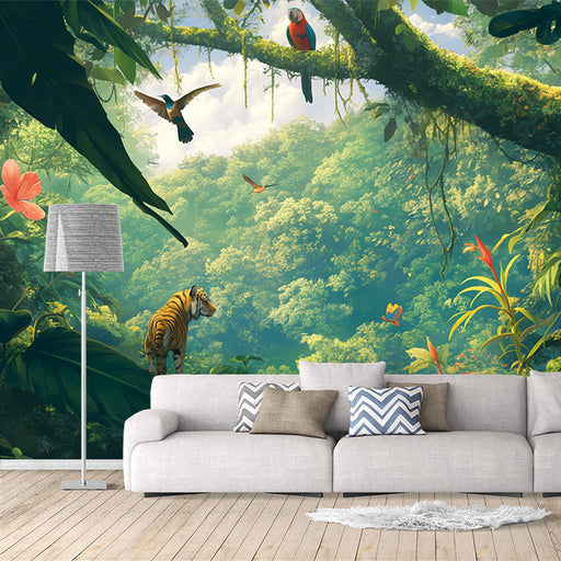 Vollständige Details anzeigenTropischer Dschungel mit Tiger-Mural-Tapete für ein Arbeitszimmer | Grün, Gelb und Blauer Dschungel