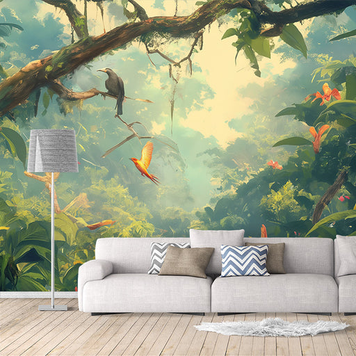Vollständige Details anzeigenTropischer Wald mit Papageien-Wandbildtapete | Grün, Gelb, Blau und Rot im Wald