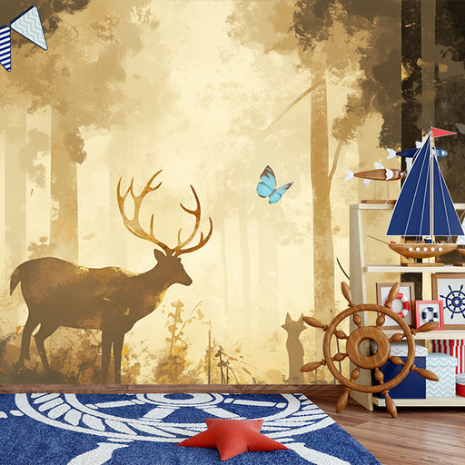 Vollständige Details anzeigenWald- und Hirsch-Wandbildtapete im Schlafzimmer | Verschiedene Grüntöne, Brauntöne und Gelbtöne des Waldes