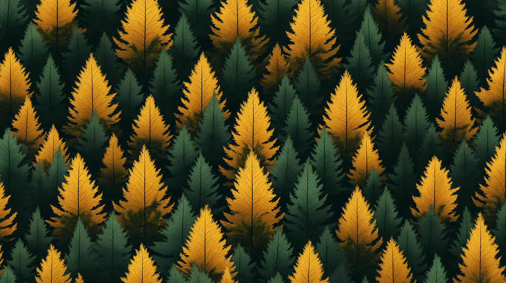Dieser Tapetenbild zeigt einen üppigen Wald aus grünen und gelben Kiefern. Das Design ist lebendig und von der Natur inspiriert, was ihn zu einer tollen Wahl für ein Wohnzimmer macht, um die Außenwelt hineinzubringen. Es kann eine gemütliche und einladende Atmosphäre schaffen.