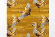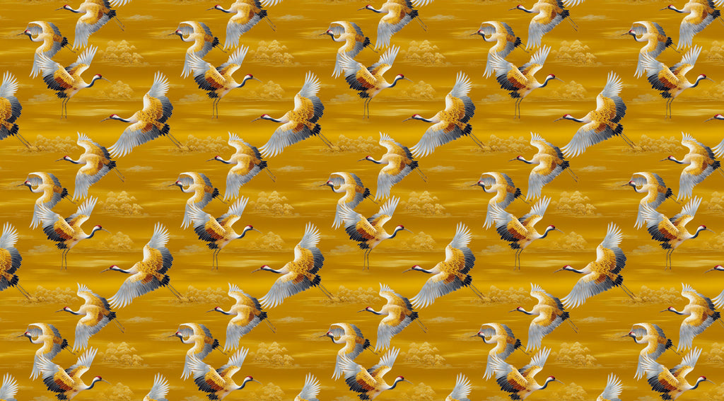 The Golden Cranes Prosperity Mural Wallpaper is a richly colored and vibrant repeating print. The design features traditional East Asian cranes in various stages of flight and dance, rendered in detailed white, gray, and warm gold. This dynamic pattern is set against an intense, highly textured golden-yellow background, evoking a sense of imperial luxury and continuous prosperity. The bold color and rhythmic repetition create an energetic yet sophisticated atmosphere. This mural is ideal for a formal dining room, a bold entryway, or an accent wall in a luxurious, culturally inspired interior.