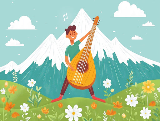 Vollständige Details anzeigenMusikalische Reise Wandbild Tapete | Kletterer mit Laute auf einem Bergpfad