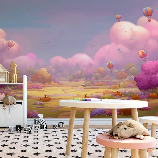 Pastellfarbene Herbstfelder Tapete | Verspielte Kürbislandschaft mit Heißluftballons