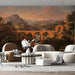 Bask in the warm glow of history with this classical landscape mural. It features a prominent Roman aqueduct or bridge stretching across a river valley, illuminated by a rich, peach-colored sunset. The scene is populated with small figures in ancient dress, surrounded by rugged mountains and trees. The moody, warm palette creates a cozy yet intellectual atmosphere, perfect for a library, living room, or hallway.