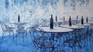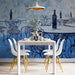 The Blue and White Cafe Scene Mural Wallpaper is a dramatic and artistic statement piece. Rendered in a dynamic, heavily textured impressionist style, the entire scene is painted in shades of intense blue and white, creating a cool, striking monochrome effect. The subject—an empty outdoor cafe dynamic, heavily textured impressionist style, the entire scene is painted in shades of intense blue with vintage wrought iron tables and chairs and floating bottles of wine—is both romantic and melancholic. The background features abstract, swirling white paint suggesting sky or foliage. This mural is an ideal choice for a sophisticated dining room, a moody lounge, or a kitchen seeking a bold, artistic focal point inspired by vintage European bistro culture.