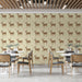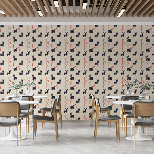 The Bold Reindeer and Candy Cane Grid Wallpaper features a clean, systematic grid of medium-sized reindeer silhouettes and small candy cane accents. The simple, dark brown reindeer against the warm cream background create a clear, graphic, and highly readable pattern. The uniform, repeating layout gives the design a structured and orderly feel, making it cheerful without being chaotic. This mural is ideal for a farmhouse-style kitchen, a structured office space, or a holiday dining room.