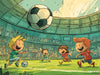 The Cartoon Kids Soccer Stadium Mural Wallpaper is a bright, cheerful, and whimsical artwork. It features large, smiling cartoon children watching small, energetic players on the pitch, with a massive soccer ball floating above. The warm, dynamic colors, soft shadows, and exaggerated figures give the scene a friendly, playful, and fun atmosphere. This mural is ideal for a nursery, a child's bedroom, a primary school play area, or a pediatrician's office waiting room.