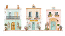 The Charming Storefronts Mural Wallpaper is a sweet and delicate piece of art. The design features a row of three distinct European-style buildings, each rendered in soft watercolor pastels—mint green, creamy yellow, and blush pink. The buildings are detailed with flower boxes, wrought-iron balconies, outdoor lamps, and quaint store entrances. The inclusion of small, watchful cats on the rooftops adds a playful narrative element. This mural is a perfect choice for a sophisticated nursery, a cozy bedroom, or a bright, feminine craft room that seeks a touch of storybook charm and artistic finesse.