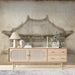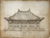 Chinese Hall Building Elevation Architectural Study Sketch Mural Wallpaper | Sepia Tones Aged Paper