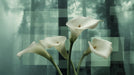 The Elegant White Calla Lilies Abstract Green Forest Mural Wallpaper features white calla lilies in the foreground against an abstract, geometric background that suggests a green forest. The juxtaposition of the organic flowers with the structured, semi-transparent geometric shapes creates a modern and sophisticated look. This mural is ideal for a contemporary living room or dining room.