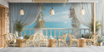 Create a romantic getaway in your own home with this enchanting wallpaper, viewing the ocean through a beautiful stone archway adorned with climbing pink flowers. The soft sunlight filters through the vines, casting gentle shadows on the tiled floor, while white curtains frame the scene with elegance. This illustration captures the charm of a Mediterranean villa, blending architecture with the beauty of nature. It is perfect for creating a warm, inviting atmosphere in cafe, living rooms, or sunrooms.