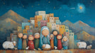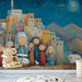 Folk Art Nativity Scene Mural Wallpaper | Stylized Figures, Colorful Townscape, Naive Style