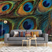 The Iridescent Peacock Feather Texture Mural Wallpaper is a stunning close-up photograph or realistic illustration of peacock feathers. It showcases the brilliant iridescent hues of electric blue, emerald green, and shimmering gold found in the "eyes" of the feathers. The rich texture and vibrant colors create a feeling of exotic luxury and opulence.