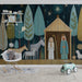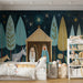 The Mid-Century Modern Nativity Mural Wallpaper is a unique, retro-inspired take on the Christmas scene. The Nativity figures and animals are simple, stylized, and geometric, positioned in front of a symmetrical forest of stylized, tear-drop shaped evergreen trees in various shades of teal, blue, and sage green. The dark background is contrasted by the pale, muted colors of the stable and figures, giving the artwork a clean, playful, and sophisticated mid-century modern aesthetic. This mural is ideal for a contemporary kid’s room, a design studio, or a space with a retro-chic focus.