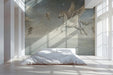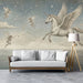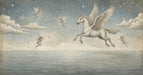 Create a truly magical space with this enchanting wall mural. The design features a majestic, white Pegasus (winged horse) in mid-flight, soaring among swirling, detailed star constellations in a deep, muted blue night sky. Accompanying it are a group of ethereal, winged fairies, also in flight, with one fairy reaching out to touch a constellation. Below, a calm, vast ocean spreads out under a horizon of soft, vintage-style clouds. The entire design is rendered in a beautiful, hand-drawn illustration style with a nostalgic, aged parchment texture. This whimsical mural is perfect for a study, kid's room, or any space seeking a touch of celestial wonder and magical charm. Pairs well with light wood, whites, and soft textiles.
