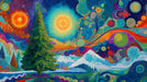 The Psychedelic Cosmic Christmas Mural Wallpaper is a maximalist, high-energy artwork featuring intense, swirling patterns and vibrant colors. A massive, stylized sun/mandala in the upper center illuminates the scene. A large, richly textured green Christmas tree stands in a highly abstract landscape of swirling lines, snowy mountains, and cosmic elements in deep blue, orange, magenta, and green. The highly decorative, fluid style creates a fantastical, dream-like atmosphere. This mural is ideal for a bold creative space, a themed entertainment room, or a living room where artistic self-expression is paramount.