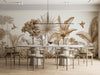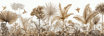 Create a sense of calm horizon with this panoramic wallpaper, featuring a landscape of various palm trees and tropical plants arranged along the bottom edge. The artwork uses a refined sepia and bronze palette, with delicate shading that emphasizes the height and elegance of the palms. Hummingbirds flit across the open sky area, adding movement to the serene scene. This illustration captures the spaciousness of a tropical landscape, perfect for widening the visual feel of a room, such as a meeting room or a long hallway.