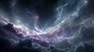 The Stormy Purple and Blue Nebula Mural Wallpaper is an intensely dramatic and dynamic cosmic scene. Massive, dark clouds in the foreground open up to a swirling nebula field dominated by electric blue, cool white, and deep purple light. Streaks of light, resembling cosmic lightning, crackle through the dense gas, conveying enormous energy and turbulence. The dark, cloudy foreground enhances the sense of depth and mystery. This mural is perfect for a cafe, a bedroom, or a space where drama and deep color are desired.