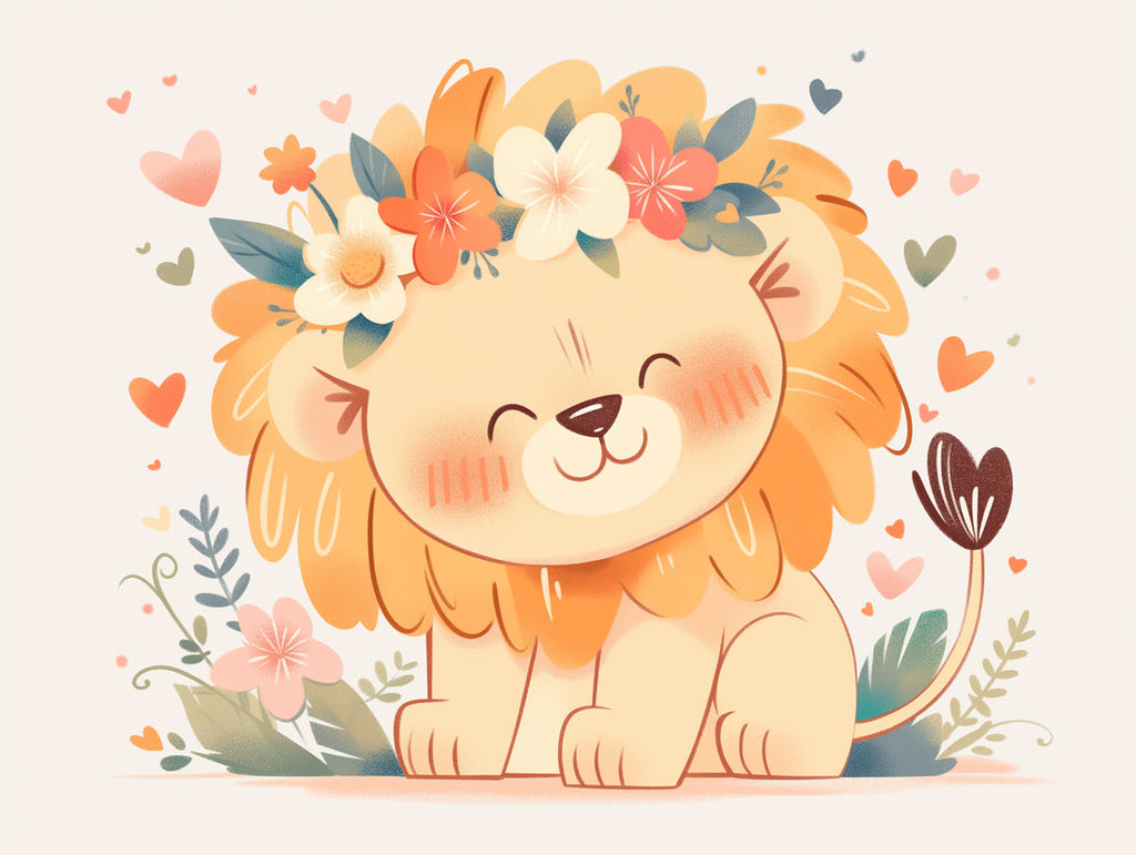 Dieses Wandbild zeigt einen entzückenden Löwen mit einer Blumenkrone, umgeben von Herzen und anderen blumigen Elementen. Das niedliche und fantasievolle Design macht es perfekt für ein Spielzimmer, schafft eine spaßige und einladende Atmosphäre für Kinder. Die sanften Farben und das zarte Bild des Löwen verleihen dem Raum einen Hauch von Charme und Wärme
