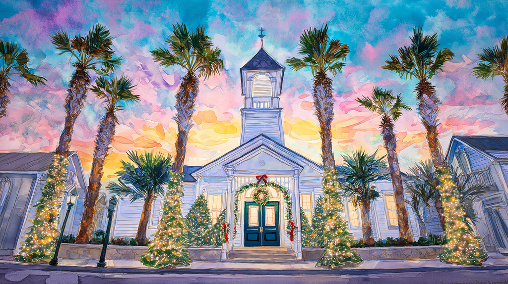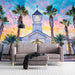 The Tropical Coastal Church Watercolor Mural Wallpaper captures a brightly lit church framed by palm trees and Christmas lights, set against a dazzling watercolor sky of pink, magenta, and gold. The scene contrasts the cool white architecture and dark silhouettes of the palm trees with the intense, tropical sunset colors. The watercolor style is fresh and expressive, offering a vibrant, non-traditional Christmas feel. This mural is ideal for a bright dining area, a casual living room, or a boutique with a coastal theme.