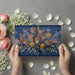 A sophisticated botanical wall mural featuring a grand bouquet of native South African flowers, including King Proteas and Banksias. The vibrant earthy tones of the flowers are set against a deep indigo blue background, which features subtle, sketch-style vintage floral line art, adding depth and a classic textile feel.